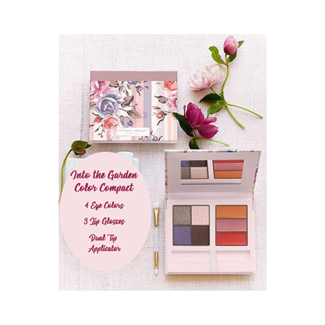 Mirrored compact with 4 eye colors and 3 lip glosses, and applicator.